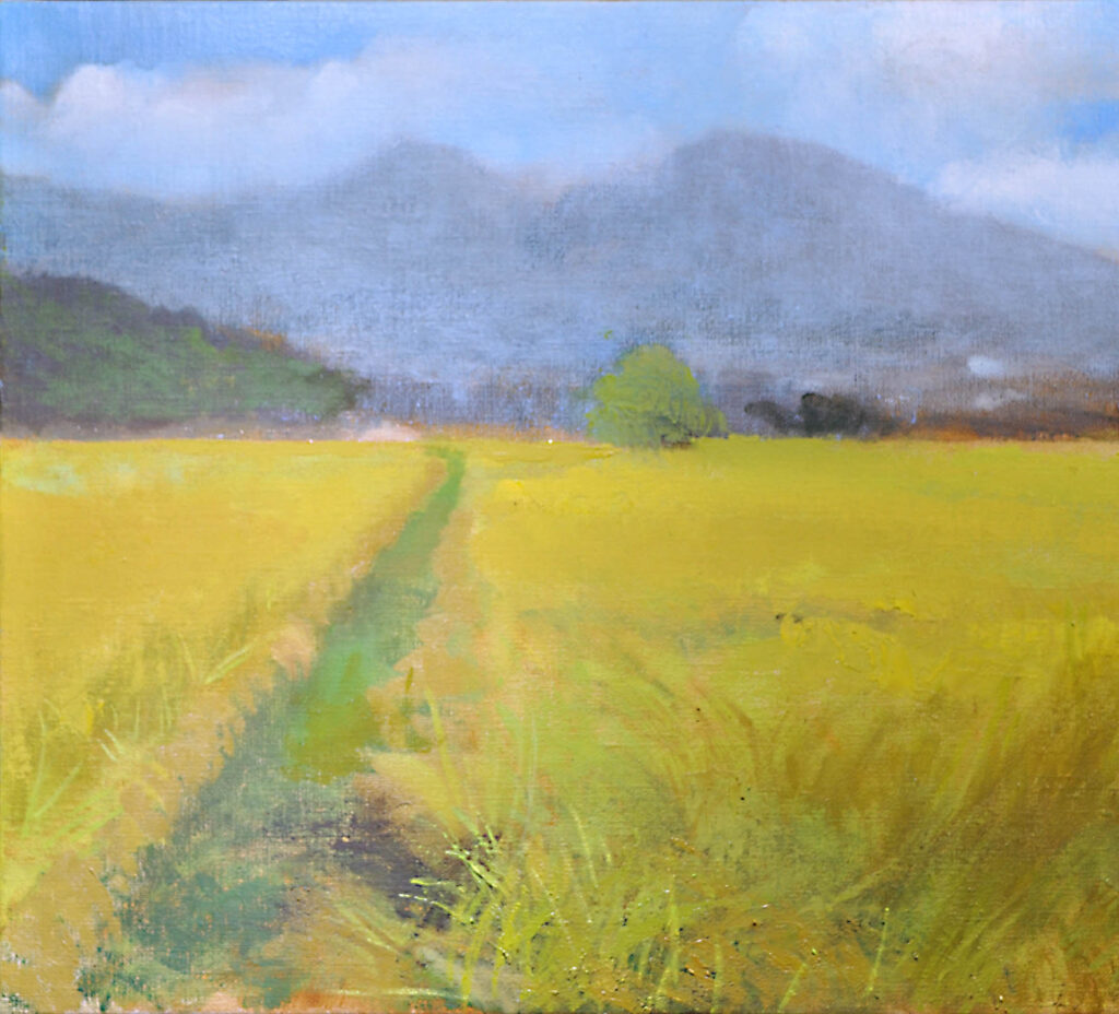 少し克明に追ってみました。やはり他の畑の絵と同じで水田も一本一本の稲の穂をかき分けるつもりで描いていかないと一面を埋め尽くす田んぼにならないことがわかりました。それから、遠景の家並みもその構図や配置を頭に入れないことには存在感が希薄なのに気が付きました。ですからこれから距離を変えてスケッチを続けて最終的に一つの画面につなげ合わせたいと思います。
