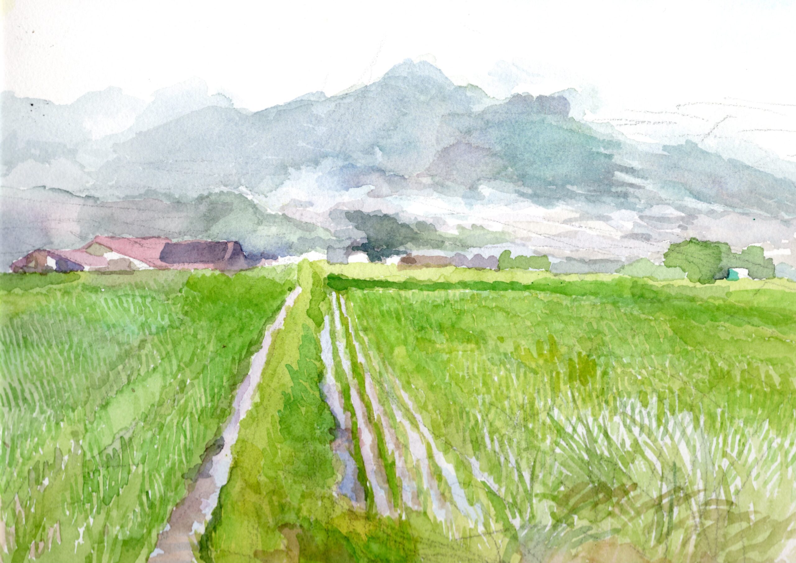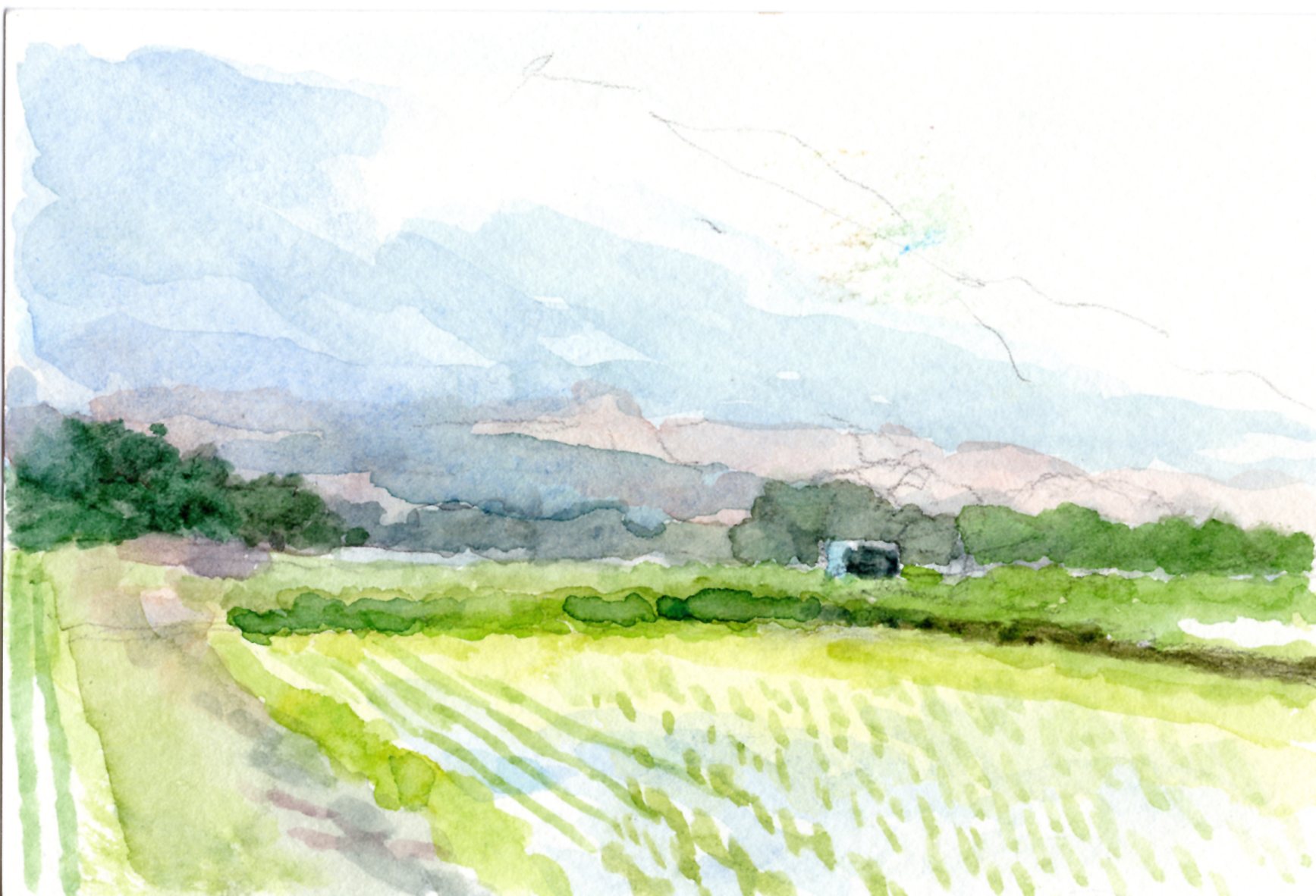 長野県佐久市浅間山のふもと浅科小学校付近の水田風景を描き始めました。